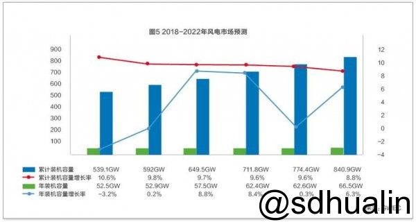 而根據GWEC《2017年(nian)(nian)(nian)全(quan)球風(feng)(feng)(feng)電(dian)發展報(bao)告》對2018-2022年(nian)(nian)(nian)全(quan)球風(feng)(feng)(feng)電(dian)市(shi)場的(de)預測,2018年(nian)(nian)(nian)全(quan)球風(feng)(feng)(feng)電(dian)市(shi)場將(jiang)基本保持(chi)在2017年(nian)(nian)(nian)的(de)水平,2019年(nian)(nian)(nian)和2020年(nian)(nian)(nian)全(quan)球風(feng)(feng)(feng)電(dian)市(shi)場恢復(fu)增長,21世(shi)紀(ji)20年(nian)(nian)(nian)代初將(jiang)再次突破60吉瓦;到2022年(nian)(nian)(nian)底,累計風(feng)(feng)(feng)電(dian)裝機容量總(zong)量將(jiang)達到840吉瓦。(見圖5)