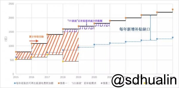 無奈之二(er)是國家對清潔能源的補(bu)(bu)貼自2015年(nian)(nian)起,到(dao)2017年(nian)(nian)年(nian)(nian)底(di)拖欠(qian)應達到(dao)1500億元,其中光伏補(bu)(bu)貼的缺口(kou)超過一半(ban),且短期內無法(fa)解決(jue)缺口(kou)問題(ti)。光伏行業(ye)持(chi)續(xu)高速增(zeng)長,考慮(lv)發電補(bu)(bu)貼將持(chi)續(xu)20年(nian)(nian),補(bu)(bu)貼金(jin)額每年(nian)(nian)疊加(jia),欠(qian)補(bu)(bu)貼的缺口(kou)將越(yue)(yue)來越(yue)(yue)大,包袱將越(yue)(yue)來越(yue)(yue)重。 2017年初,為(wei)解決缺(que)口,國(guo)(guo)家發(fa)(fa)改委、財政部和(he)國(guo)(guo)家能源(yuan)局聯合發(fa)(fa)布了《試行可(ke)再生能源(yuan)綠(lv)色電力(li)證(zheng)書核發(fa)(fa)及自愿認(ren)購交易(yi)(yi)制(zhi)度(du)(du)(du)的通知》。綠(lv)證(zheng)由國(guo)(guo)家可(ke)再生能源(yuan)信息管理中心負責(ze)核發(fa)(fa),每1000度(du)(du)(du)綠(lv)電可(ke)獲得一個(ge)綠(lv)證(zheng),核發(fa)(fa)后可(ke)在中國(guo)(guo)綠(lv)色電力(li)證(zheng)書認(ren)購交易(yi)(yi)平(ping)臺(tai)出(chu)售,各級(ji)政府(fu)機(ji)(ji)關(guan)、企(qi)事(shi)業(ye)單位(wei)、社會機(ji)(ji)構和(he)個(ge)人(ren)均可(ke)認(ren)購,以此來分擔國(guo)(guo)家對光伏(fu)及風電企(qi)業(ye)的補貼。然而(er)(er)綠(lv)證(zheng)制(zhi)度(du)(du)(du)并非強制(zhi)執(zhi)行,而(er)(er)是采取自愿制(zhi)度(du)(du)(du),由其他企(qi)業(ye)和(he)個(ge)人(ren)決定(ding)是否購買,因此該制(zhi)度(du)(du)(du)還只是一個(ge)概念。 總之,光伏新政的(de)(de)(de)實施確實可以減(jian)緩補(bu)貼(tie)缺口(kou)的(de)(de)(de)加劇擴大(da)(參見圖二),也可減(jian)輕并網消納的(de)(de)(de)巨大(da)壓力。